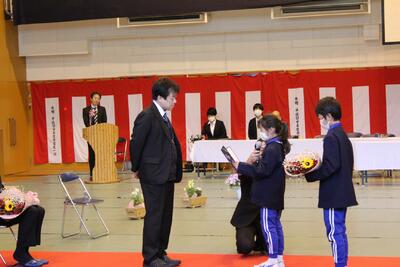 先生方から最後のお話と挨拶をしていただき、児童代表の子たちが感謝のお手紙と花束を渡しました。