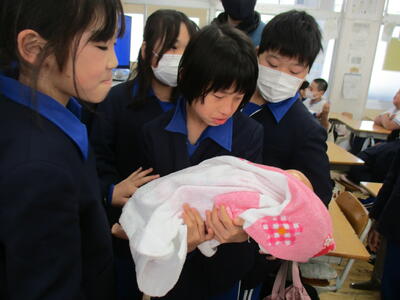 一人一人生まれたての赤ちゃんの人形(3000g)を抱き、その重さや小ささを思い思いに味わっていました。