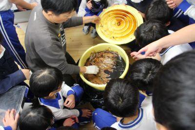 12月17日(水)に、4年生が1年前に仕込んだ味噌樽を開封し、タッパーに入れて家に持ち帰りました。