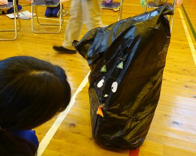1年生の出し物は、「さがしびとはだれですか」。黒い袋を頭からかぶって座り、誰が入っているかを6年生にさがし当ててもらいました。なかなか自分の班の1年生を見つけるのは難しかったようです。1年生は、「幸せを運ぶ鳥のメダル」をプレゼントしました。