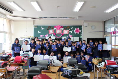 4年生は、縄跳びで対決を試みました。3分間で何回跳ぶことができるかで勝負しました。結果、さすがに6年生が勝利しました。そして、4年生は、小さな「手作りランドセル」をプレゼントしました。